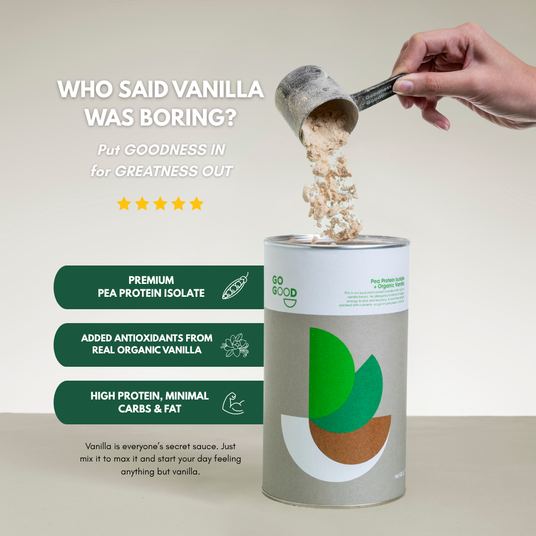 Made with world leading European Golden Pea Protein and fortified with real, Organic Plant Protein to flavour. Go Good Organic Plant Protein is a nutritionally complete and delicious tasting protein source.