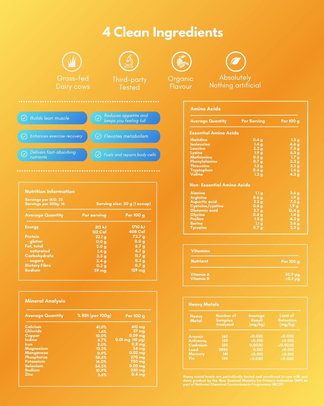 Grass-Fed Cows: New Zealand dairy cows maintain a natural diet grazing on lush chemical free grass pastures. Non NZ whey protein is sourced from cows that are usually raised on un-natural corn or soy based diets and injected with antibiotics to survive unsanitary conditions.