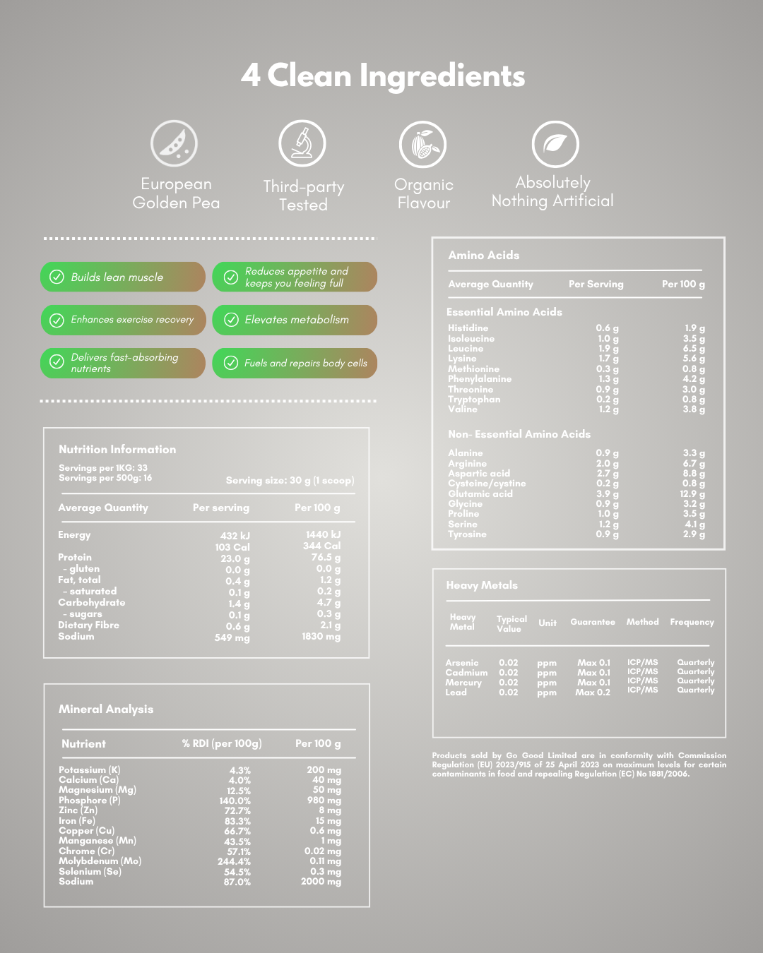 Made with world leading European Golden Pea Protein and fortified with real, Organic Vanilla to flavour. Go Good Organic Vanilla is a nutritionally complete and delicious tasting protein source.