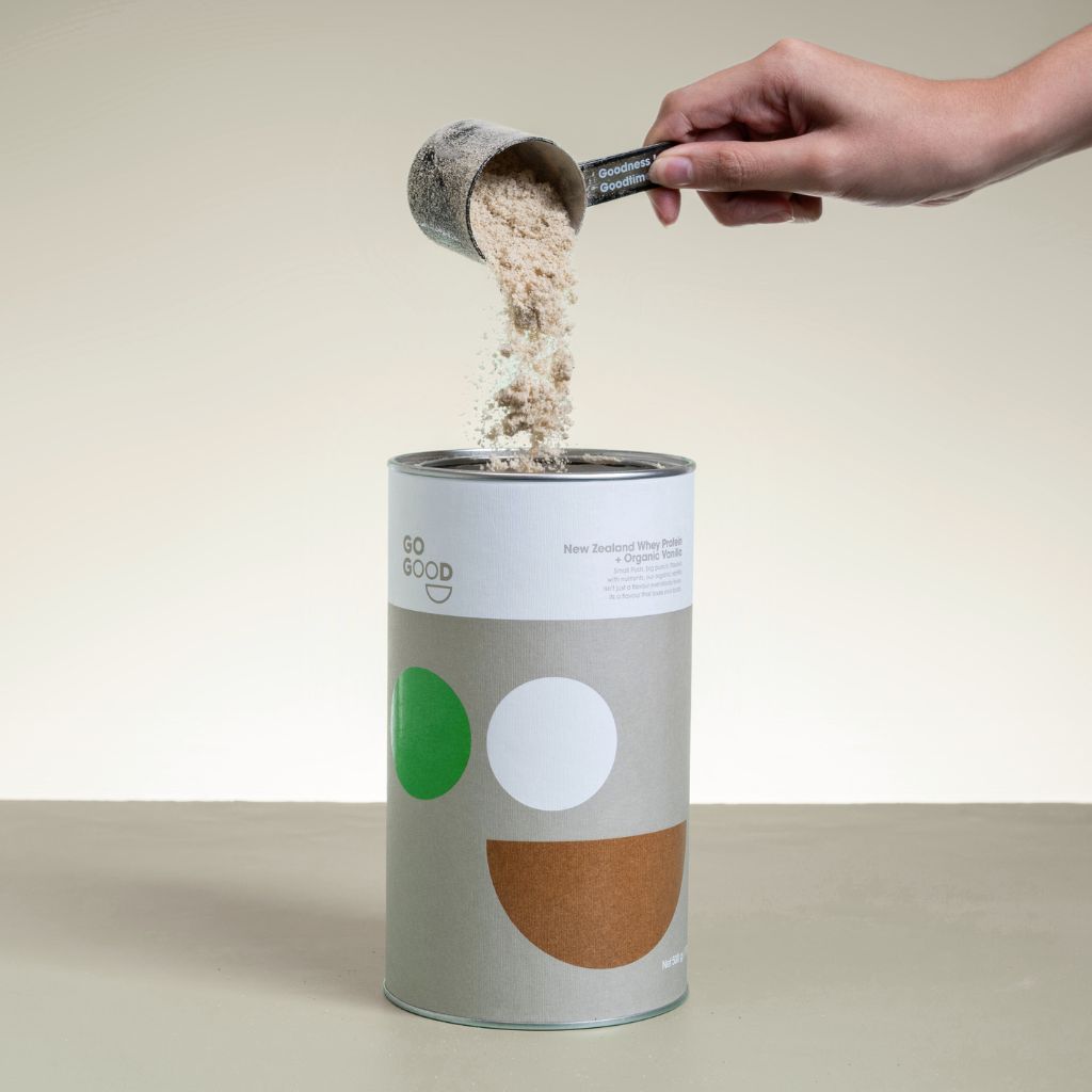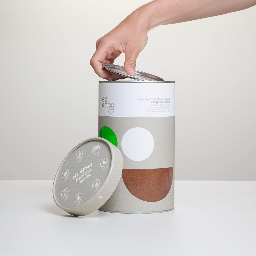 We’ve put the same love and care into our packaging as we have into our protein powders. Our canisters are made from 90% recycled cardboard, our scoop is compostable and even the packaging tape is plastic free. Go Good… go guilt free.