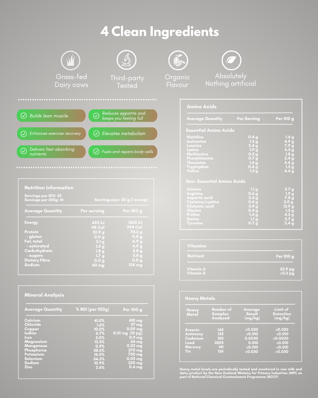 Grass-Fed Cows: New Zealand dairy cows maintain a natural diet grazing on lush chemical free grass pastures. Non NZ whey protein is sourced from cows that are usually raised on un-natural corn or soy based diets and injected with antibiotics to survive unsanitary conditions.