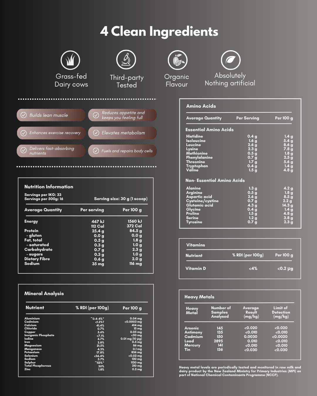 New Zealand Whey Protein Isolate with Emulsifier (non-GMO Sunflower Lecithin), Organic Cacao Powder, Natural Sweetener (Thaumatin).